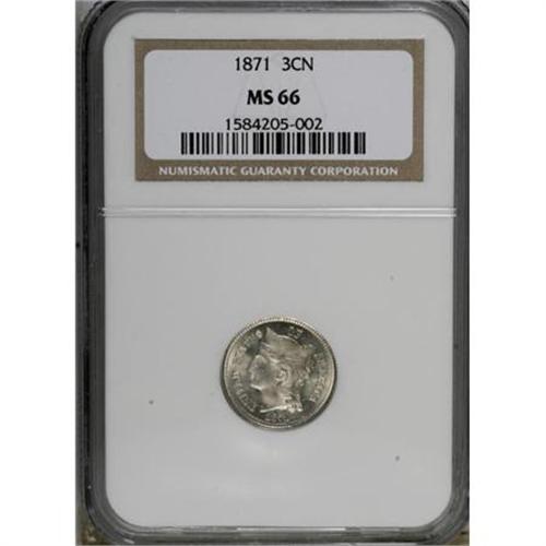 <B>1871 3CN MS66 NGC.</B></I> A hint of dusky gold patina is noted here and there, but this lustrous Premium Gem is otherwise untoned. Sharply struck and exceptionally preserved. Struck from a prominently clashed obverse die. Census: 7 in 66, 1 finer (2/08).<BR><BR><B>Coin Engraver:</B> James B. Longacre<BR><BR><b>Shipping:</b> Coins & Currency (<a target="_blank" href="http://www.heritageauctions.com/common/shipping.php">view shipping information</a>)