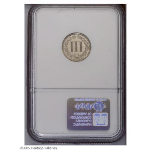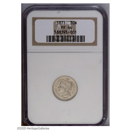 <B>1871<3CN> PR64 NGC.</B></I> A very Choice specimen, well struck with a light coating of olive-gray patina covering each side, and satiny proof surfaces that are free of hairlines. A few wispy marks are seen on Liberty's cheek, under magnification.