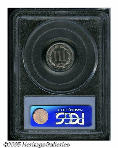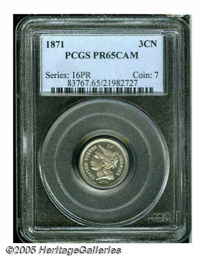 <B>1871<3CN> PR65 Cameo PCGS.</B></I> Fully brilliant with illimitable depth of watery reflectivity that has a tendency to contrast with the central devices. Scarce with these qualities.