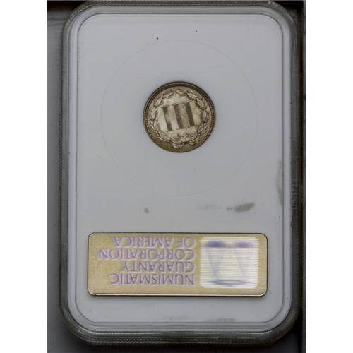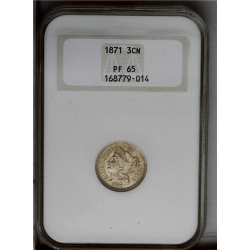 <B>1871<3CN> PR65 NGC.</B></I> A pleasing Gem with lightly toned surfaces. All design elements are sharply defined with reflective underlying surfaces. <BR><BR><B>Important notice:</B> Heritage usually auctions material at the rate of 200-250 lots per hour. On some occasions eBay Live bid software or the Internet may not be able to keep up with the pace of the auction. We recommend placing a realistic absentee bid now as insurance to avoid disappointment. Occasionally the auctioneer may eliminate or reject an eBay Live bid, and the auctioneer may also reopen a lot after the close of the eBay live bidding (usually because we missed an audience bid), and may reject your bid even if it shows you as the winning bidder. By bidding via eBay Live, you agree that Heritage may award the lot to another bidder at its sole discretion under the circumstances described above or any other reasonable circumstances. Since eBay bids are not shown to us until we open the lot on the floor, we treat those bids just like floor bids. In most cases the floor responds before the eBay bid is presented to us, due to Internet lag time, so for consistency we have made it a policy that floor bids are always considered first over tie eBay live bids. Also please note that all Heritage lots purchased through eBay Live carry a 20% Buyer's Premium. Please make sure you read the Terms and Conditions before you bid. This lot is being auctioned in conjunction with a live floor auction by Heritage Galleries & Auctioneers. All final auction and invoice information will be supplied by Heritage Galleries & Auctioneers, and all other information should be considered preliminary. Lot:805 <BR><BR><B>Winning Notification and Billing:</B> After the FINAL session in this auction is complete, Heritage will send e-mail and snail mail invoices. This process normally takes several days. All final auction and invoice information will be supplied by Heritage Galleries & Auctioneers, and all other information should be considered preliminary. <BR><BR>This auction will be conducted on a live auction floor and over the Internet through eBay Live. If you choose to place an absentee bid, please take a moment to <font color='#0000ff'><u><a href='http://pages.ebay.com/liveauctions/help/before/laabsentee.html'>learn how eBay Live absentee bidding works</a></u></font><font color='#000000'>