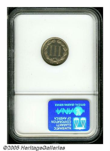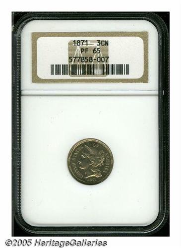 <B>1871<3CN> PR65 NGC.</B></I> Coppery-rose surfaces and nice semi-matte luster. The lines in the denomination are well separated. An attractive Gem proof.