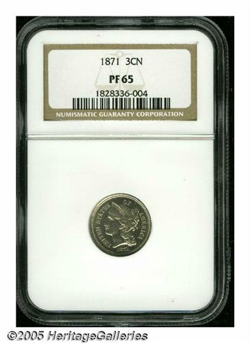 <B>1871<3CN> PR65 NGC.</B></I> The 1871 is scarcer proof Three Cent Nickel from a mintage of 960 pieces, and survivors at this level are far more challenging than most proof issues in the series. Faint speckles of milky color dot the bright proof surfaces, and the design elements are exquisitely struck. A few trivial marks are noted on Liberty's cheek. Population: 93 in 65, 32 finer (3/05).
