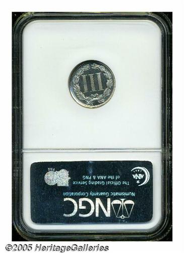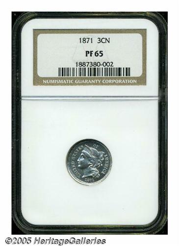 <B>1871<3CN> PR65 NGC.</B></I> The currently offered example is fully struck and untoned, with bright silver-gray surfaces that have been expertly preserved, and display a small planchet flaw on Liberty's cheekbone. An attractive Gem. Population: 93 in 65, 32 finer (3/05).