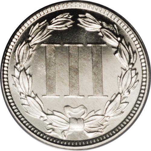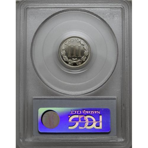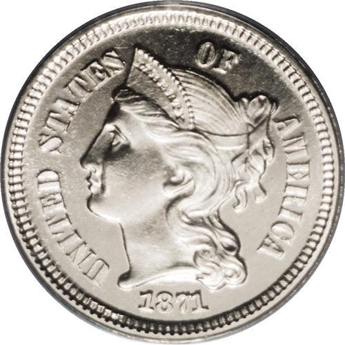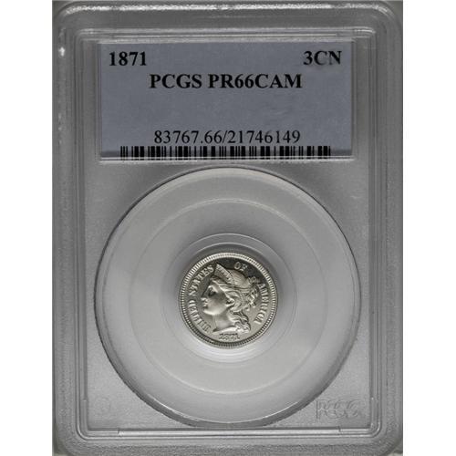 <B>1871<3CN> PR66 Cameo PCGS.</B></I> This proof example has untoned, silver-white surfaces that are highly mirrored, with lightly frosted devices that produce a pleasing Cameo effect. As expected from the Premium Gem designation, there are few abrasions or distractions of any kind. Population: 4 in 66, 1 finer (1/06).