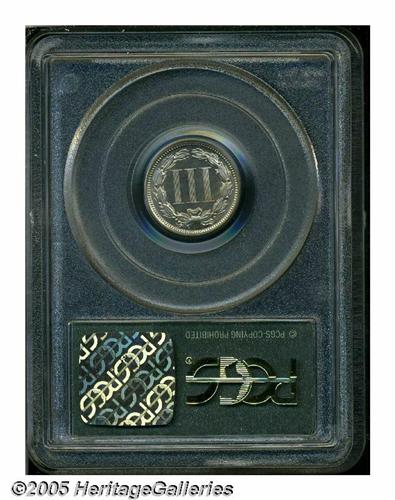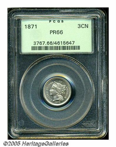 <B>1871<3CN> PR66 PCGS.</B></I> Bright nickel-gray surfaces exhibit touches of light tan patina, and remain very well preserved. All of the design features are well impressed. Population: 20 in 66, 0 finer (6/05).