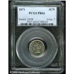 <B>1871 3CN PR66 PCGS.</B></I> Intricately detailed with the slightest tinge of lemon-yellow and blue pastels in the areas surrounding the devices. A beautifully preserved Three Cent Nickel proof. Population: 18 in 66, 0 finer (1/05). Lot:5791