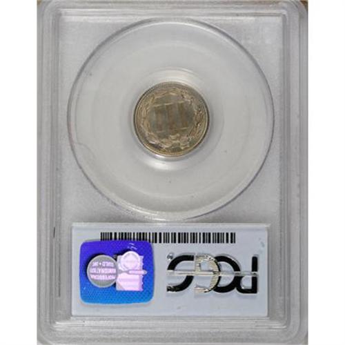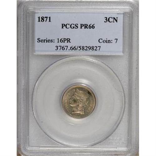 <B>1871 3CN PR66 PCGS.</B></I> This is a lovely Premium Gem proof that exhibits nearly unimprovable quality. The design elements are crisply struck and the surfaces are essentially untoned, save for a touch of color on Liberty's cheekbone. A small window of prooflikeness, from die polish, is noted near the upper right obverse border, between OF and AMERICA. Population: 23 in 66, 0 finer (4/07). <BR><BR><b>Shipping:</b> Coins & Currency (<a target="_blank" href="http://www.heritageauctions.com/common/shipping.php">view shipping information</a>)