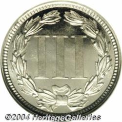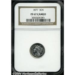 <B>1871<3CN> PR67 Cameo NGC.</B></I> The surfaces approach technical perfection on this completely snow-white, untoned proof. The fields are exceptionally deep in their mirrored reflectivity, the devices are nicely frosted, yielding a pronounced cameo effect overall. This is the single finest cameo proof example thus far certified by either service (6/04). <BR><BR><B>Important notice:</B> Heritage usually auctions material at the rate of 200-250 lots per hour. On some occasions eBay Live bid software or the Internet may not be able to keep up with the pace of the auction. We recommend placing a realistic absentee bid now as insurance to avoid disappointment. Occasionally the auctioneer may eliminate or reject an eBay Live bid, and the auctioneer may also reopen a lot after the close of the eBay live bidding (usually because we missed an audience bid), and may reject your bid even if it shows you as the winning bidder. By bidding via eBay Live, you agree that Heritage may award the lot to another bidder at its sole discretion under the circumstances described above or any other reasonable circumstances. Since eBay bids are not shown to us until we open the lot on the floor, we treat those bids just like floor bids. In most cases the floor responds before the eBay bid is presented to us, due to Internet lag time, so for consistency we have made it a policy that floor bids are always considered first over tie eBay live bids. Also please note that all Heritage lots purchased through eBay Live carry a 20% Buyer's Premium. Please make sure you read the Terms and Conditions before you bid. </span></font></tr></table></td></tr></table>