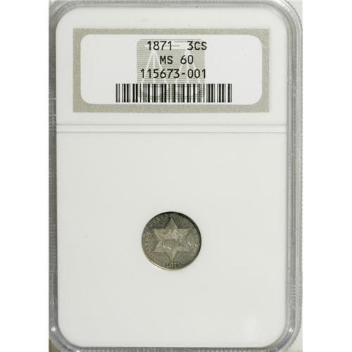<B>1871 3CS MS60 NGC.</B></I> Well struck with areas of mercury-gray and midnight-blue toning. Luminous with myriad wispy marks and a handful of abrasions that restrict the grade. One of just 3,400 pieces struck.<BR><BR><b>Shipping:</b> Coins & Currency (<a target="_blank" href="http://www.heritageauctions.com/common/shipping.php">view shipping information</a>)