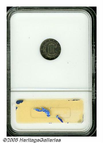 <B>1871<3CS> MS65 NGC.</B></I> Only 3,400 business strikes were produced of the 1871 three cent silver. The obverse offers splotches of cobalt-blue, gold, and rose patination, while the reverse is mostly rose-gold. The design features are well struck, and there are no mentionable marks to report. Population: 19 in 65, 50 finer (4/05).