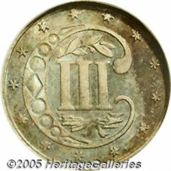 <B>1871 3CS MS66 NGC.</B></I> A high-end example, covered by deep multicolored patina on both sides. Just 3,400 business strikes were issued, and only an occasional piece from a small, high quality hoard, long since dispersed, provides the majority of known Gems. Sharply struck, with vibrant luster beneath the rich toning, and no apparent surface blemishes. Note: the NGC holder is chipped at the lower left corner.