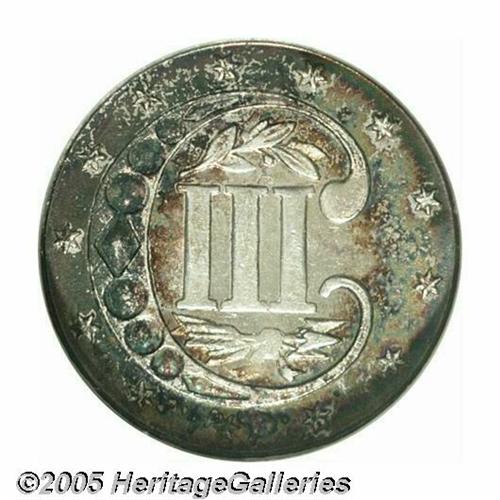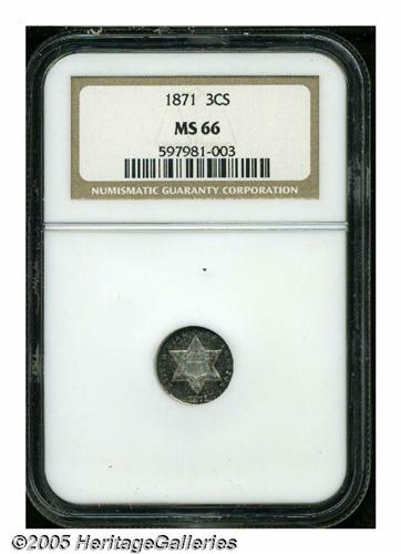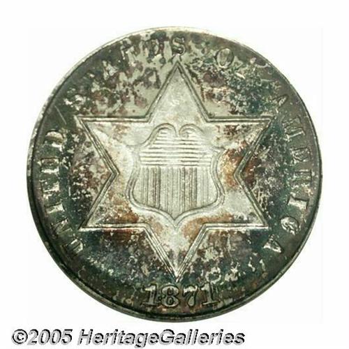 <B>1871<3CS> MS66 NGC.</B></I> Boldly struck with fine satiny luster and a lovely mix of russet and sea-green colors. The exquisitely preserved surfaces seem blemish-free. One of just 3,400 business strikes issued, and several times scarcer than similarly dated proofs. Population: 31 in 66, 19 finer (4/05).