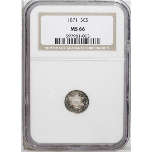 1871 3CS MS66 NGC. Boldly struck with satiny luster an