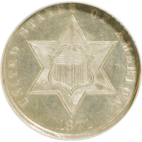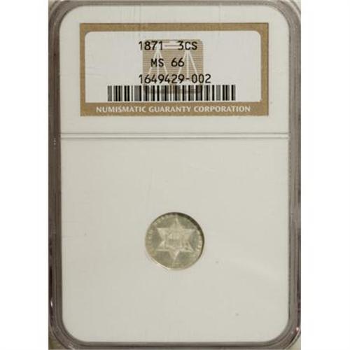 <B>1871 3CS MS66 NGC.</B></I> NGC Census: (33/20). PCGS Population (13/11). Mintage: 3,400. Numismedia Wsl. Price for NGC/PCGS coin in MS66: $1,825. (#3692)<BR><BR><B>Coin Engraver:</B> James B. Longacre<BR><BR><b>Shipping:</b> Coins & Currency (<a target="_blank" href="http://www.heritageauctions.com/common/shipping.php">view shipping information</a>\)