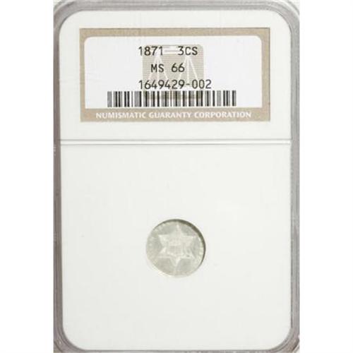 <B>1871 3CS MS66 NGC.</B></I> Delicate frost visits the devices, while the minimally toned fields gleam. A delightfully preserved survivor from this elusive late-date trime issue of just 3,400 pieces. Census: 35 in 66, 20 finer (11/07).<BR><BR><B>Coin Engraver:</B> James B. Longacre<BR><BR><b>Shipping:</b> Coins & Currency (<a target="_blank" href="http://www.heritageauctions.com/common/shipping.php">view shipping information</a>)
