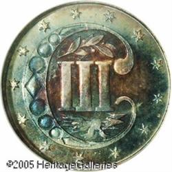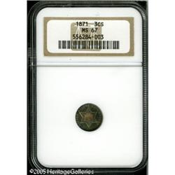 <B>1871 3CS MS67 NGC.</B></I> A high-end prooflike specimen. The surfaces sparkle with bright reflectivity and show no apparent flaws on either side. Both sides are covered with deep blue patina and show spotty accents of antique-golden and crimson on each side. One of the finest business strikes known of this highly respected issue. Population: 19 in 67, 2 finer (1/05). Lot:5669