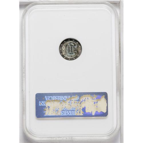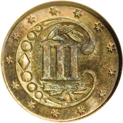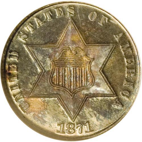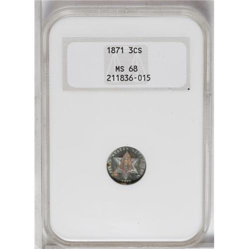 <B>1871<3CS> MS68 NGC.</B></I> This exceptional coin shows no traces of the usual abrasions or hairlines so often seen on three cent silver pieces. Close examination with a magnifier could convince the viewer that even at the MS68 level this coin is undergraded. Only 3,400 pieces were struck of the 1871. This piece displays bright, highly reflective fields, apparently an early striking, over which delectable iridescent blue, amber, and violet tones float. While it is always difficult to say for certain with toned coins, it appears that the devices are heavily frosted. So, is this coin actually a proof? Absolutely not. The horizontal lines on the shield on the obverse, the knot in the bow on the reverse as well as the reverse stars lack the absolute clarity of strike that a double-struck proof would possess. Identifiable by a small toning speck between the TE of UNITED. Census: 3 in 68, 0 finer (8/06).