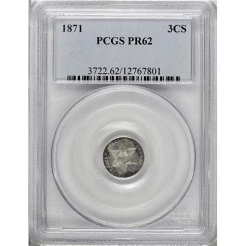 <B>1871 3CS PR62 PCGS.</B></I> PCGS Population (40/228). NGC Census: (18/153). Mintage: 960. Numismedia Wsl. Price for NGC/PCGS coin in PR62: $396. (#3722)<BR><BR><B>Coin Engraver:</B> James B. Longacre<BR><BR><b>Shipping:</b> Coins & Currency (<a target="_blank" href="http://www.heritageauctions.com/common/shipping.php">view shipping information</a>)