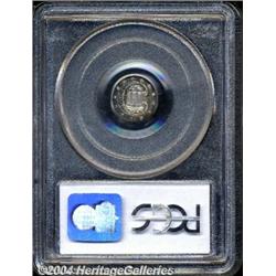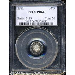 <B>1871<3CS> PR64 PCGS.</B></I> Aqua blue, lavender, and burnt-orange patina covers the border areas of both sides, framing the silver-gray centers of the main devices. The centers are somewhat weakly struck, and a few light, trivial ticks show on the shield and Roman Numeral III.<BR><I>Ex: California State N.A., John Cobb Sale (4/67), lot 775 where it realized $96.</B></I> <BR><BR><B>Important notice:</B> Heritage usually auctions material at the rate of 200-250 lots per hour. On some occasions eBay Live bid software or the Internet may not be able to keep up with the pace of the auction. We recommend placing a realistic absentee bid now as insurance to avoid disappointment. Occasionally the auctioneer may eliminate or reject an eBay Live bid, and the auctioneer may also reopen a lot after the close of the eBay live bidding (usually because we missed an audience bid), and may reject your bid even if it shows you as the winning bidder. By bidding via eBay Live, you agree that Heritage may award the lot to another bidder at its sole discretion under the circumstances described above or any other reasonable circumstances. Since eBay bids are not shown to us until we open the lot on the floor, we treat those bids just like floor bids. In most cases the floor responds before the eBay bid is presented to us, due to Internet lag time, so for consistency we have made it a policy that floor bids are always considered first over tie eBay live bids. Also please note that all Heritage lots purchased through eBay Live carry a 20% Buyer's Premium. Please make sure you read the Terms and Conditions before you bid.