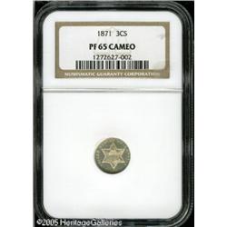 <B>1871 3CS PR65 Cameo NGC.</B></I> A boldly struck and flashy Gem with noticeable white on black contrast and only a hint of rose color on the upper obverse. Cameos of this date are difficult to find. Population: 3 in 65 Cameo, 4 finer (1/05). Lot:5685