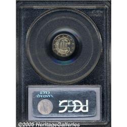 <B>1871 3CS PR66 Cameo PCGS.</B></I> In 1871, only 4,360 three cent silver pieces were produced with 960 of that total being proofs. This is certainly one of the most attractive examples we have seen recently. Unlike the often-seen heavily toned coins from the 1860s and early 1870s, the surfaces on this piece are brilliant throughout with shimmering proof fields and sharply contrasting frosted devices. Population: 3 in 66, 0 finer (2/05).