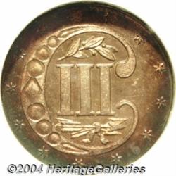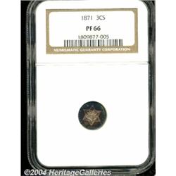 <B>1871<3CS> PR66 NGC.</B></I> This unbelievably toned trime features a ring of gunmetal blue toning at the margins, that grades into a deep bluish-purple, transitioning to a lighter purple, and finally to a low-intensity reddish-orange at the centers. The design elements are boldly impressed, and the surfaces are essentially devoid of significant marks. Population: 18 in 66, 9 finer (7/04). <BR><BR><B>Important notice:</B> Heritage usually auctions material at the rate of 200-250 lots per hour. On some occasions eBay Live bid software or the Internet may not be able to keep up with the pace of the auction. We recommend placing a realistic absentee bid now as insurance to avoid disappointment. Occasionally the auctioneer may eliminate or reject an eBay Live bid, and the auctioneer may also reopen a lot after the close of the eBay live bidding (usually because we missed an audience bid), and may reject your bid even if it shows you as the winning bidder. By bidding via eBay Live, you agree that Heritage may award the lot to another bidder at its sole discretion under the circumstances described above or any other reasonable circumstances. Since eBay bids are not shown to us until we open the lot on the floor, we treat those bids just like floor bids. In most cases the floor responds before the eBay bid is presented to us, due to Internet lag time, so for consistency we have made it a policy that floor bids are always considered first over tie eBay live bids. Also please note that all Heritage lots purchased through eBay Live carry a 20% Buyer's Premium. Please make sure you read the Terms and Conditions before you bid. </span></font></tr></table></td></tr></table>