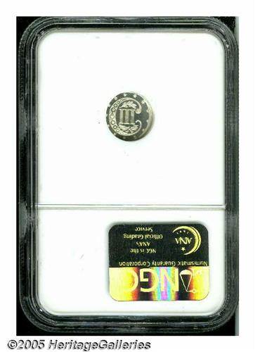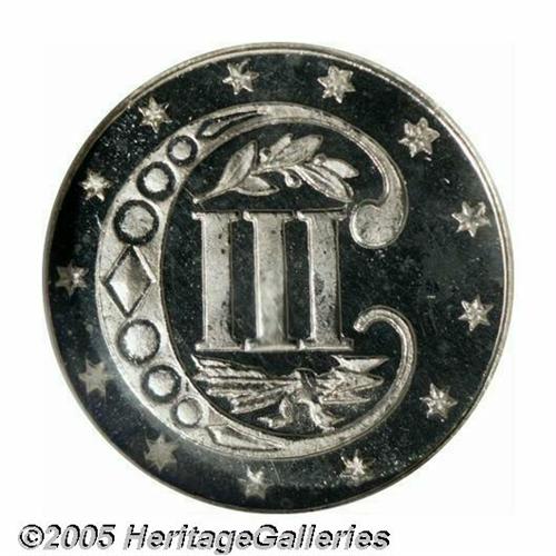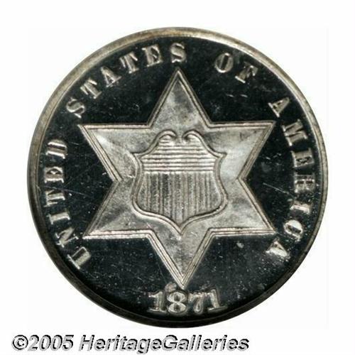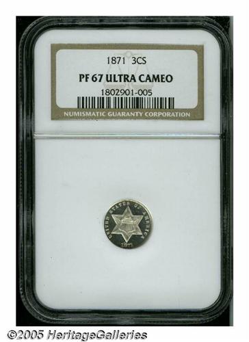 <B>1871<3CS> PR67 Ultra Cameo NGC.</B></I> Mintage records indicate that 960 of these Proofs were struck in 1871, and possibly one-third of those actually survive today. Very few of those survivors are in Gem or Superb Gem condition. In fact, this example is the single finest Proof example certified by NGC. It is also <B>the only Ultra Cameo</B></I> of the date certified by NGC, regardless of grade. Similarly, PCGS has never graded a Deep Cameo example of the date. Both the obverse and the reverse are fully brilliant without any trace of toning. The fields and devices have exceptional contrast. This is a beautiful coin for the connoisseur. For the collector of Cameo Proof coinage, it is the ultimate. Population: 1 in 67, 0 finer (1/05).