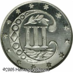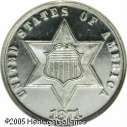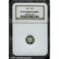 <B>1871 3CS PR67 Ultra Cameo NGC.</B></I> Mintage records indicate that 960 of these Proofs were struck in 1871, and possibly one-third of those actually survive today. Very few of those survivors are in Gem or Superb Gem condition. In fact, this example is the single finest Proof example certified by NGC. It is also <B>the only Ultra Cameo</B></I> of the date certified by NGC, regardless of grade. Similarly, PCGS has never graded a Deep Cameo example of the date. Both the obverse and the reverse are fully brilliant without any trace of toning. The fields and devices have exceptional contrast. This is a beautiful coin for the connoisseur. For the collector of Cameo Proof coinage, it is the ultimate. Population: 1 in 67, 0 finer (1/05). Lot:5686