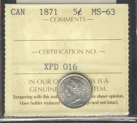 1871 5¢ ICCS MS63. Nice strong lustre.