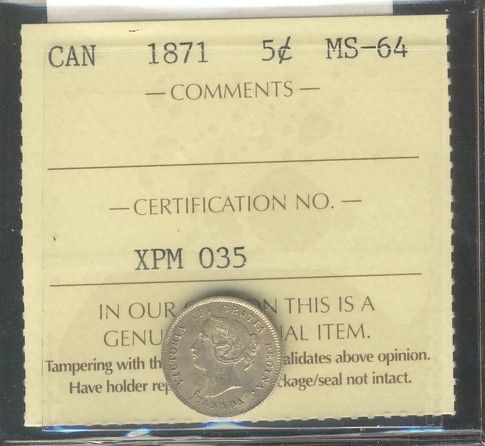 1871 5¢ ICCS MS64. Luster of gold tones.