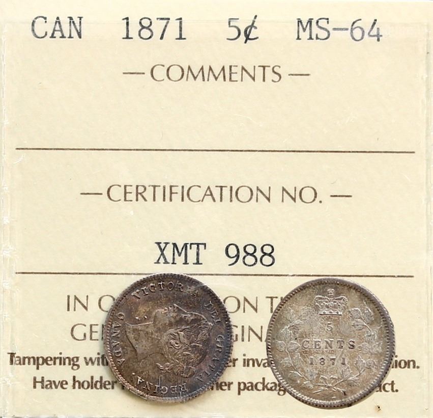 1871 5¢ ICCS Very Choice Mint State-64. A very nice near Gem example.