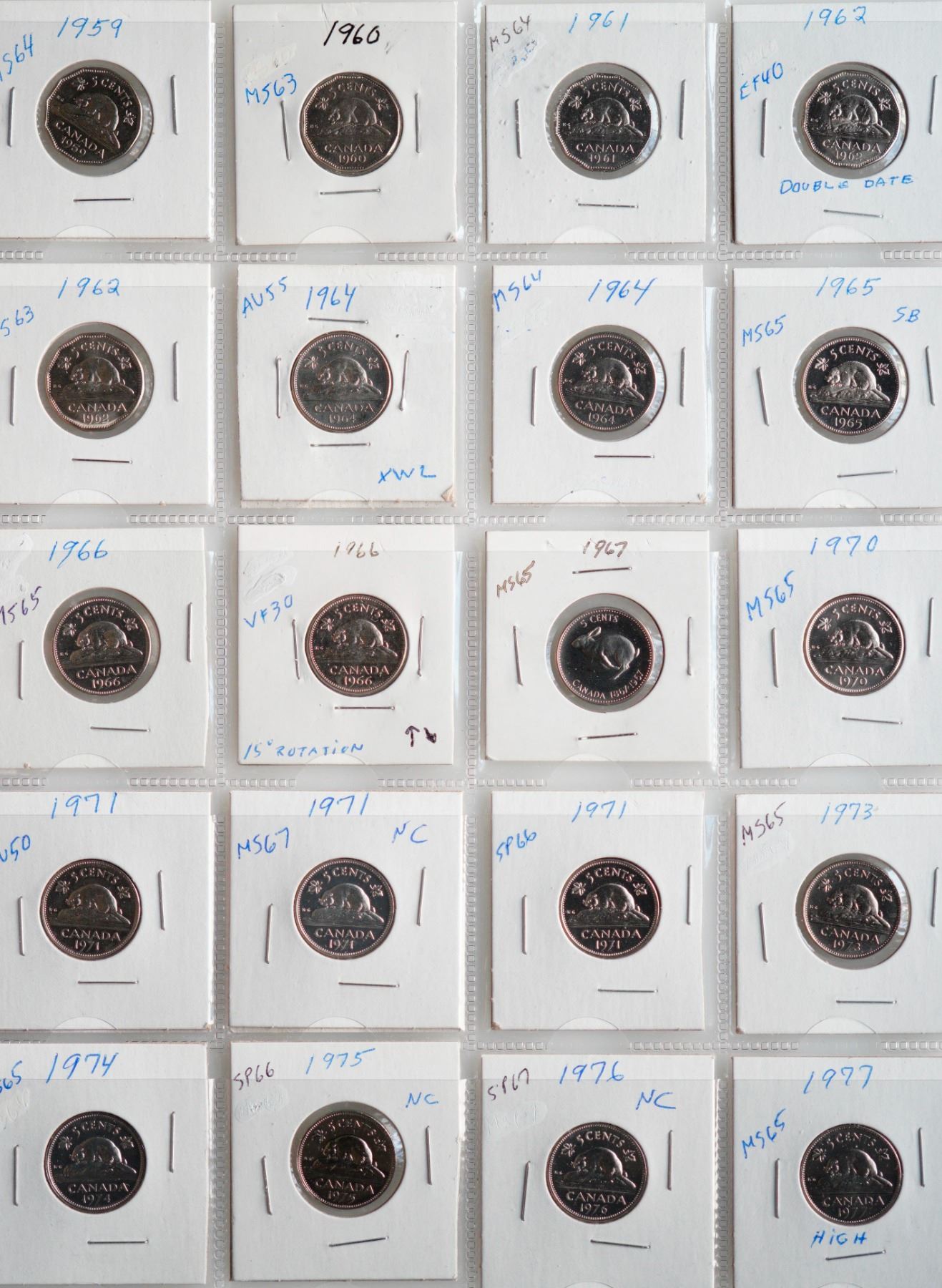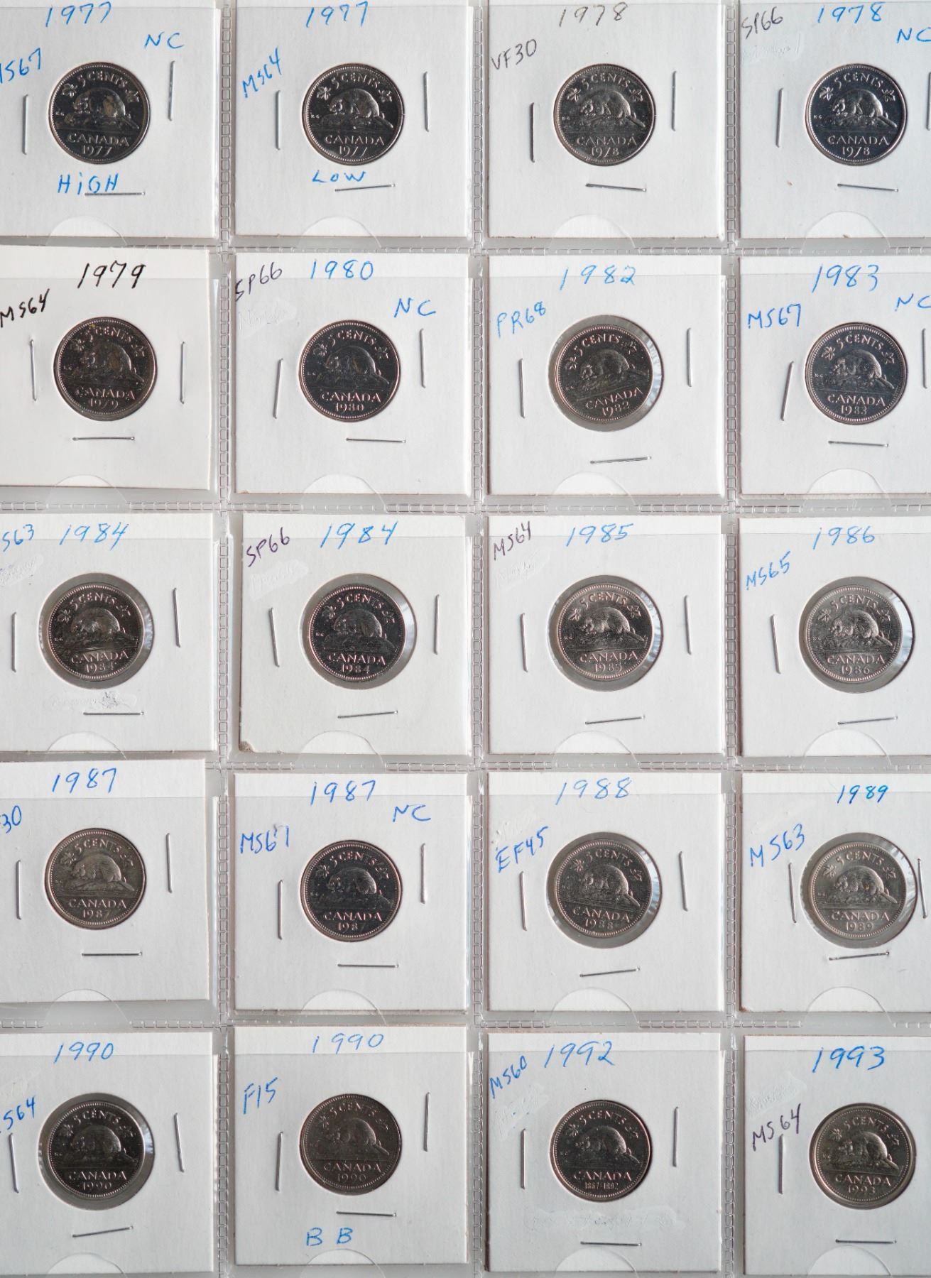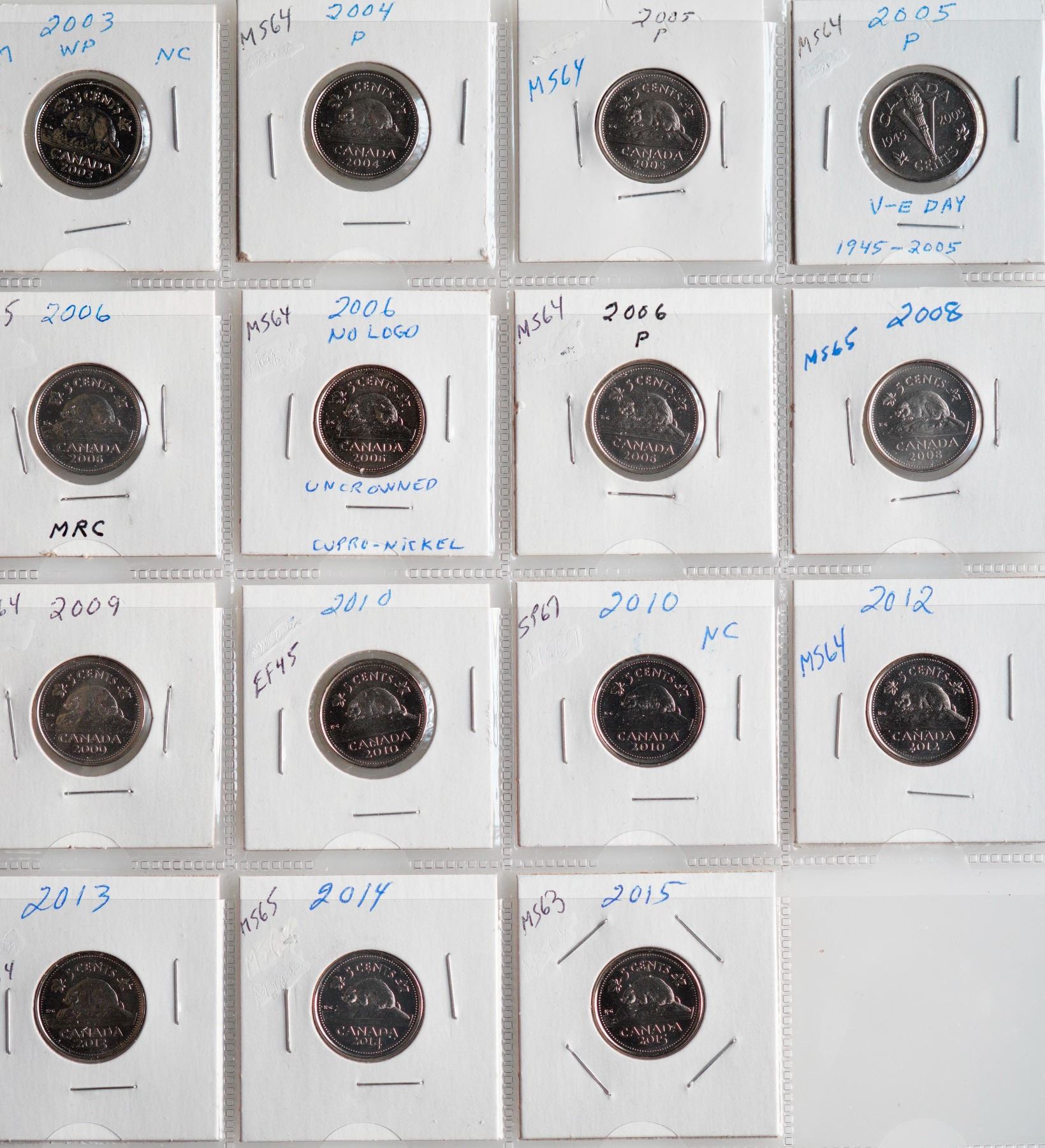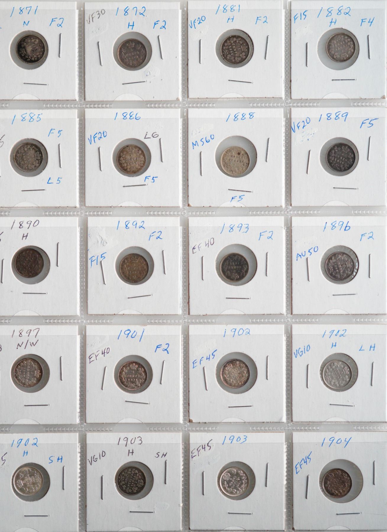 1871 5¢ to 2015 Partial Date Set; includes Victoria 1871, 1872H, 1881H,1882H, 1885, 1886 Lg, 1888, 1889, 1890H, 1892, 1893, 1896, 1897, 1901, Edward VII 1902, 1902H Lg, 1902H Sm, 1903H, 1903, 1904, 1905(3), 1906, 1907, 1908 Sm, 1909, 1910(2), Edward V 1911, 1915, 1916 , 1923 to 1936 (missing only 1930). A nice lot with some lustrous AU to UNC examples but for the most part VG to VF. Also includes 1937 to 2015 (97 pcs) VG to BU.