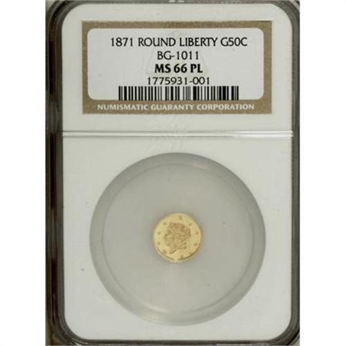 <B>1871 50C Liberty Round 50 Cents, BG-1011, R.2, MS66 Prooflike NGC.</B></I> Prominently reflective fields and a mark-free appearance ensures the quality of this beautiful Period Two Premium Gem. Sharply struck aside from the base of the wreath.<BR><I>From The Vanek Collection.</B></I><BR><BR><b>Shipping:</b> Coins & Currency (<a target="_blank" href="http://www.heritageauctions.com/common/shipping.php">view shipping information</a>)