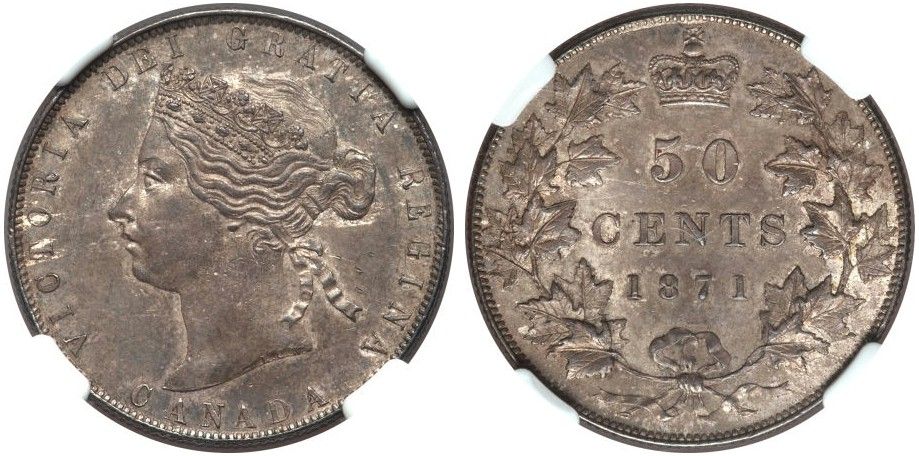 1871 50¢ NGC MS62 Light and attractively toned over underlying lustre. Sharp strike with nice surfaces. This coin is very rare in mintstate condition.