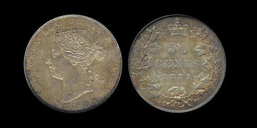 1871 50¢ PCGS MS63 Fully struck with strongly lustrous surfaces that are attractively toned in light-medium ambers with irridescent blue and violet overtones and accents. Tied for finest known. A very rare Victorian example! Don't miss this opportunity