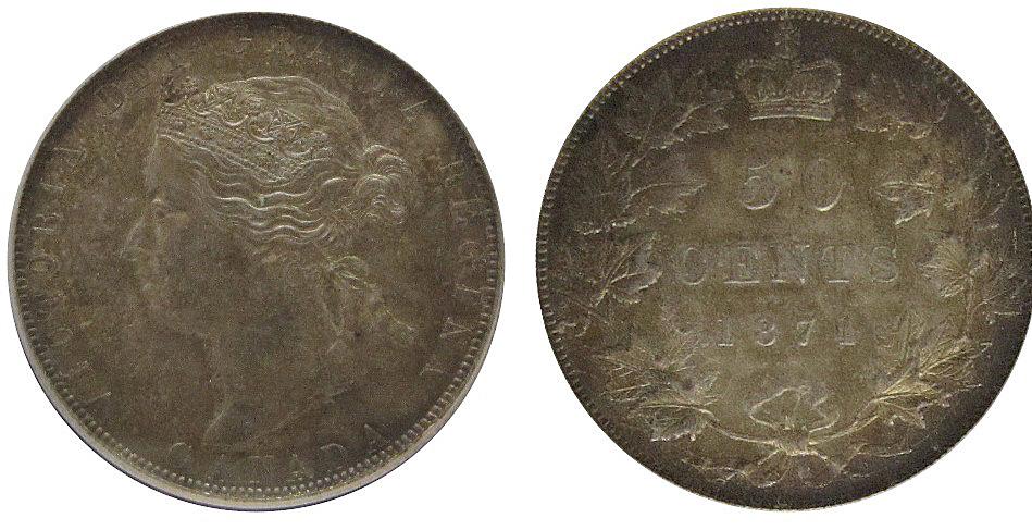 1871 50¢ PCGS MS63, Light to medium autumn shades over underlying luster. An extremely rare coin in mintstate condition.