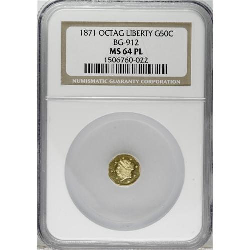 <B>1871 50C Liberty Octagonal 50 Cents, BG-912, R.3, MS64 Prooflike NGC.</B></I> A moderately reflective representative that possesses surprising contrast on the obverse. Well struck with small patches of haze on the reverse. Census: 1 in 64 Prooflike, 3 finer (1/07).<BR><BR><b>Shipping:</b> Coins & Currency (<a target="_blank" href="http://www.heritageauctions.com/common/shipping.php">view shipping information</a>)