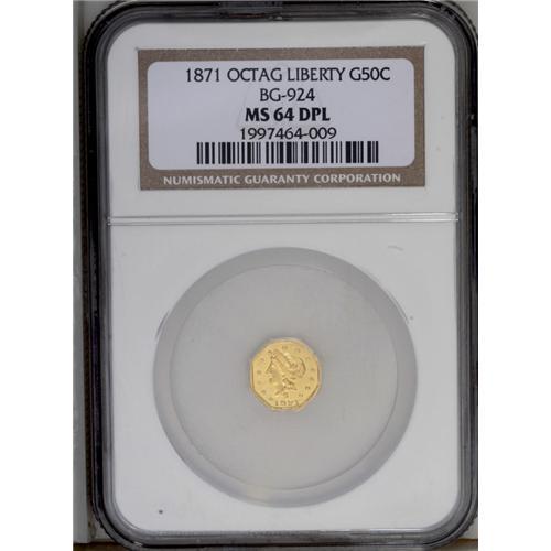 <B>1871<50C> Liberty Octagonal 50 Cents, BG-924, R.3, MS64 Deep Mirror Prooflike NGC.</B></I> Intense and flashy with a degree of black-and-gold cameo contrast. Some satiny spots appear on the reverse, likely due to difficulties of workmanship.