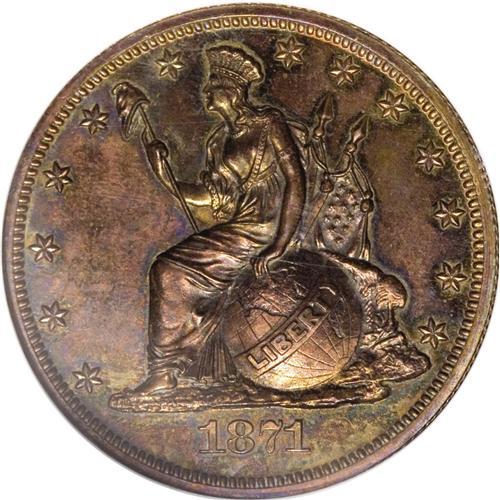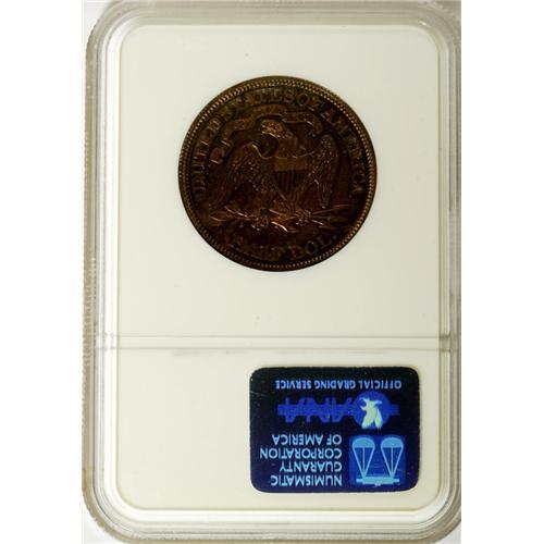<B>1871 50C Half Dollar, Judd-1115, Pollock-1251, R.7, PR64 Red and Brown NGC.</B></I> Longacre's Indian Princess design, which was presumably executed by William Barber since Longacre died in 1869. Liberty is seated facing left. She holds a Liberty pole with one hand while the other hand rests upon a globe inscribed LIBERTY. Two flags rise behind her, one of which bears 13 stars. The obverse border also has 13 stars. The reverse is from regular issue dies. Struck in copper with a reeded edge. When held at just the slightest angle, this rich coppery-orange specimen exhibits dazzling reflectivity and is accented in colorful oil-slick iridescence.<BR><BR><b>Shipping:</b> Coin/Currency (<a target="_blank" href="http://www.heritageauctions.com/common/shipping.php">view shipping information</a>)