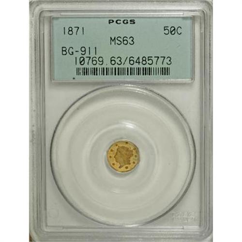 <B>1871 50C Liberty Octagonal 50 Cents, BG-911, R.4, MS63 PCGS.</B></I> PCGS Population (21/38). NGC Census: (2/8). (#10769)<BR><BR><b>Shipping:</b> Coins & Currency (<a target="_blank" href="http://www.heritageauctions.com/common/shipping.php">view shipping information</a>)