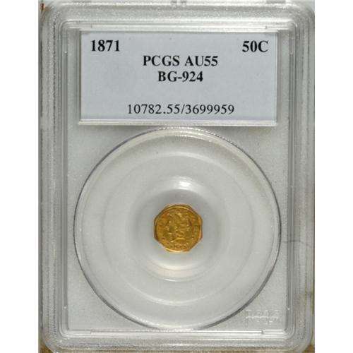<B>1871 50C Liberty Octagonal 50 Cents, BG-924, R.3, AU55 PCGS.</B></I> PCGS Population (18/181). NGC Census: (1/26). (#10782)<BR><BR><b>Shipping:</b> Coins & Currency (<a target="_blank" href="http://www.heritageauctions.com/common/shipping.php">view shipping information</a>)