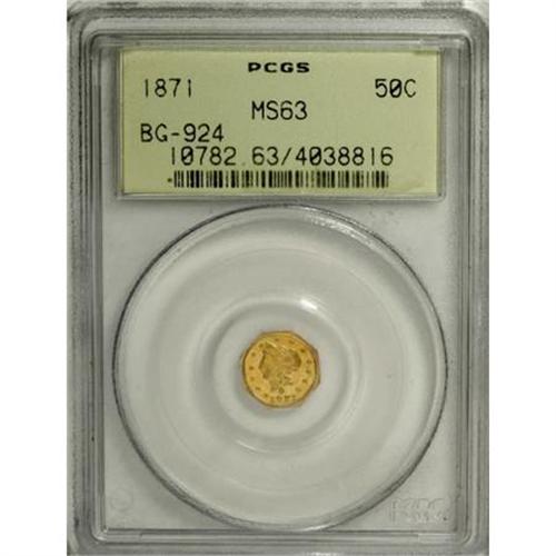 <B>1871 50C Liberty Octagonal 50 Cents, BG-924, R.3, MS63 PCGS.</B></I> PCGS Population (35/17). NGC Census: (4/7). (#10782)<BR><BR><b>Shipping:</b> Coins & Currency (<a target="_blank" href="http://www.heritageauctions.com/common/shipping.php">view shipping information</a>)