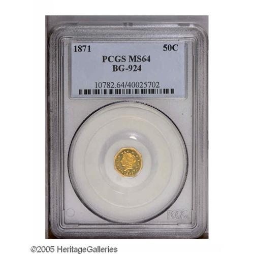 <B>1871<50C> Liberty Octagonal 50 Cents, BG-924, R.3, MS64 PCGS.</B></I> The doubled G under the bust and the Roman style I in the date identify this variety. On the reverse, the berry below C of CAL is diagnostic as well. Die lines crisscross the portrait. A few trivial reverse abrasions are all that prevent a higher grade.<BR><I>From The Frank Manthey Collection of Gold Coins.</B></I>