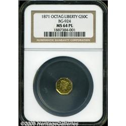 <B>1871 50C Liberty Octagonal 50 Cents, BG-924, R.3, MS64 Prooflike NGC.</B></I> The G (for Gray) initial is widely repunched on this charming variety, which imitates the contemporary Federal gold dollar. Honey patina graces the flashy yellow-gold fields. The strike is good although the O in DOLLAR is faint.