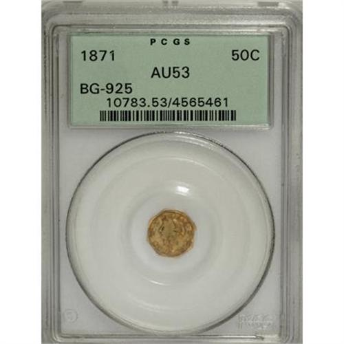 <B>1871 50C Liberty Octagonal 50 Cents, BG-925, High R.4, AU53 PCGS.</B></I> PCGS Population (3/54). NGC Census: (0/0). (#10783)<BR><BR><b>Shipping:</b> Coins & Currency (<a target="_blank" href="http://www.heritageauctions.com/common/shipping.php">view shipping information</a>)