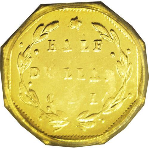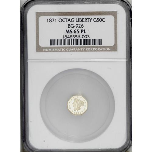 <B>1871<50C> Liberty Octagonal 50 Cents, BG-926, High R.6, MS65 Prooflike NGC.</B></I> A deeply mirrored Gem with lovely lemon-yellow surfaces and sharply defined devices. Extremely rare and desirable in this condition. This specimen is several points finer than the two PCGS-graded examples, and the finest and only example graded at NGC (9/06).