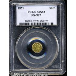 <B>1871<50C> Liberty Octagonal 50 Cents, BG-927, Low R.5, MS62 PCGS.</B></I> A flashy example with a few faint hairlines on the reflective fields. A nicely struck representative of this scarce variety. Population: 6 in 62, 4 finer (3/04). <BR><BR><B>Important notice:</B> Heritage usually auctions material at the rate of 200-250 lots per hour. On some occasions eBay Live bid software or the Internet may not be able to keep up with the pace of the auction. We recommend placing a realistic absentee bid now as insurance to avoid disappointment. Occasionally the auctioneer may eliminate or reject an eBay Live bid, and the auctioneer may also reopen a lot after the close of the eBay live bidding (usually because we missed an audience bid), and may reject your bid even if it shows you as the winning bidder. By bidding via eBay Live, you agree that Heritage may award the lot to another bidder at its sole discretion under the circumstances described above or any other reasonable circumstances. Since eBay bids are not shown to us until we open the lot on the floor, we treat those bids just like floor bids. In most cases the floor responds before the eBay bid is presented to us, due to Internet lag time, so for consistency we have made it a policy that floor bids are always considered first over tie eBay live bids. Also please note that all Heritage lots purchased through eBay Live carry a 20% Buyer's Premium. Please make sure you read the Terms and Conditions before you bid.