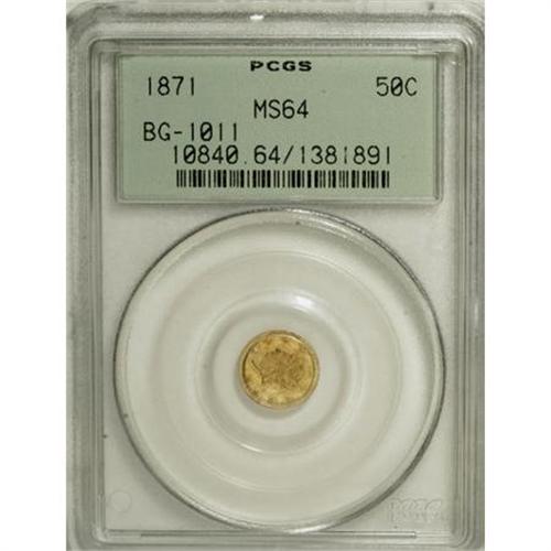 <B>1871 50C Liberty Round 50 Cents, BG-1011, R.2, MS64 PCGS.</B></I> PCGS Population (56/35). NGC Census: (3/10). (#10840)<BR><BR><b>Shipping:</b> Coins & Currency (<a target="_blank" href="http://www.heritageauctions.com/common/shipping.php">view shipping information</a>)