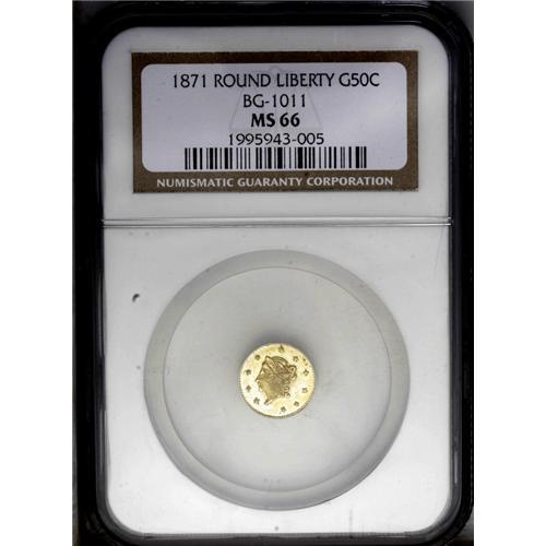 <B>1871<50C> Liberty Round 50 Cents, BG-1011, R.2, MS66 NGC.</B></I> Typically struck and seemingly pristine, without any of the usual planchet flaws or pinscratches that plague these small gold coins. The subtly variegated khaki-green and orange-tan coloration is very appealing, and the surfaces display full shimmering luster. <BR><BR><B>Important notice:</B> Heritage usually auctions material at the rate of 200-250 lots per hour. On some occasions eBay Live bid software or the Internet may not be able to keep up with the pace of the auction. We recommend placing a realistic absentee bid now as insurance to avoid disappointment. Occasionally the auctioneer may eliminate or reject an eBay Live bid, and the auctioneer may also reopen a lot after the close of the eBay live bidding (usually because we missed an audience bid), and may reject your bid even if it shows you as the winning bidder. By bidding via eBay Live, you agree that Heritage may award the lot to another bidder at its sole discretion under the circumstances described above or any other reasonable circumstances. Since eBay bids are not shown to us until we open the lot on the floor, we treat those bids just like floor bids. In most cases the floor responds before the eBay bid is presented to us, due to Internet lag time, so for consistency we have made it a policy that floor bids are always considered first over tie eBay live bids. Also please note that all Heritage lots purchased through eBay Live carry a 20% Buyer's Premium. Please make sure you read the Terms and Conditions before you bid. This lot is being auctioned in conjunction with a live floor auction by Heritage Galleries & Auctioneers. All final auction and invoice information will be supplied by Heritage Galleries & Auctioneers, and all other information should be considered preliminary. Lot:4801 <BR><BR><B>Winning Notification and Billing:</B> After the FINAL session in this auction is complete, Heritage will send e-mail and snail mail invoices. This process normally takes several days. All final auction and invoice information will be supplied by Heritage Galleries & Auctioneers, and all other information should be considered preliminary. <BR><BR>This auction will be conducted on a live auction floor and over the Internet through eBay Live. If you choose to place an absentee bid, please take a moment to <font color='#0000ff'><u><a href='http://pages.ebay.com/liveauctions/help/before/laabsentee.html'>learn how eBay Live absentee bidding works</a></u></font><font color='#000000'>
