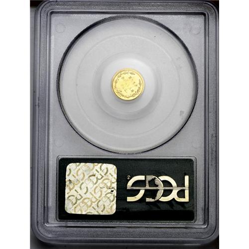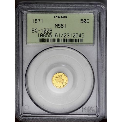 <B>1871<50C> Liberty Round 50 Cents, BG-1026, Low R.4, MS61 PCGS.</B></I> This prooflike Period Two gold piece has good eye appeal in spite of a few light field marks. Each side has a lengthy, slender die crack. Housed in an old green label holder.